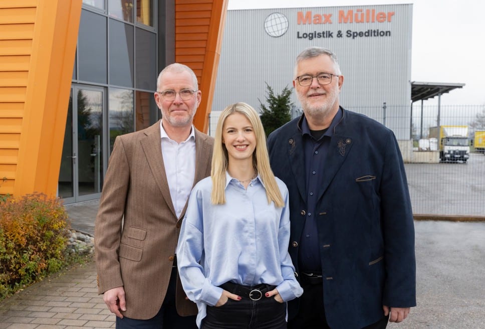 Foto: © Max Müller Spedition GmbH / Bildlegende: Geschäftsführer Oliver Groten (links) und Walter Müller (rechts) mit Stefanie Müller (Mitte) vor dem Hauptsitz in Opfenbach