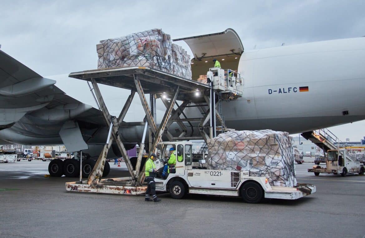 Foto: © Lufthansa Cargo / Fotolegende: Verlad von Hilfsgütern am Flughafen Frankfurt