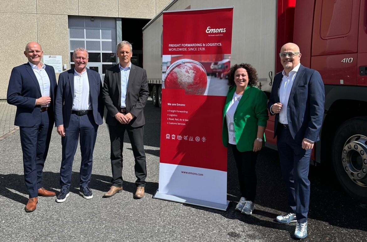 Foto: ©  Emons / Bildlegende (v.l.n.r.): Arne Lingemann Geschäftsleitung int., Thorsten Heuser CFO Emons Holding, Stefan Eller GF Emons Schweiz AG, Gabriele Degenhart GF Medeg Logistics AG, Ralf Wieland CEO Emons Holding
