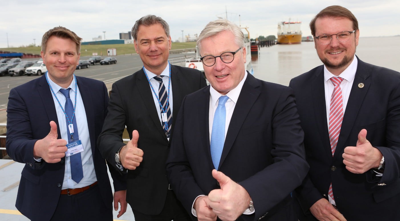 Foto: © seaports / Bildlegende: (v.l.n.r.) André Heim, Geschäftsführer Seaports of Niedersachsen GmbH, Frank Erschkat, Senior Vice President Intermodal Sales DB Cargo & Sprecher der Geschäftsführung TFG Transfracht, Dr. Bernd Althusmann, Niedersächsischer Minister für Wirtschaft, Arbeit, Verkehr und Digitalisierung, Tim Kruithoff, Oberbürgermeister der Stadt Emden
