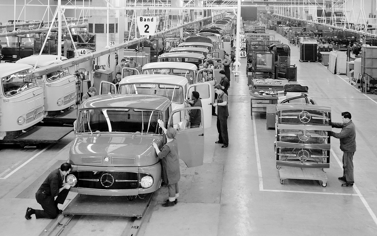 (Wörth am Rhein) Gefertigt wurden zunächst Lkw-Fahrerhäuser, die damals noch zur weiteren Montage in die Werke Gaggenau (schwere Lkw) oder Mannheim (mittelschwere und leichte Lkw) geliefert wurden. Ab 1965 stand Wörth im Fokus der Nutzfahrzeugproduktion bei Mercedes-Benz. Im zentralen Montagewerk wurden nun komplette Fahrzeuge montiert und ausgeliefert. Die Standorte Gaggenau und Kassel spezialisierten sich auf den Bau von Getrieben und Achsen für Lastwagen, Mannheim auf Motoren und die Produktion von Bussen.