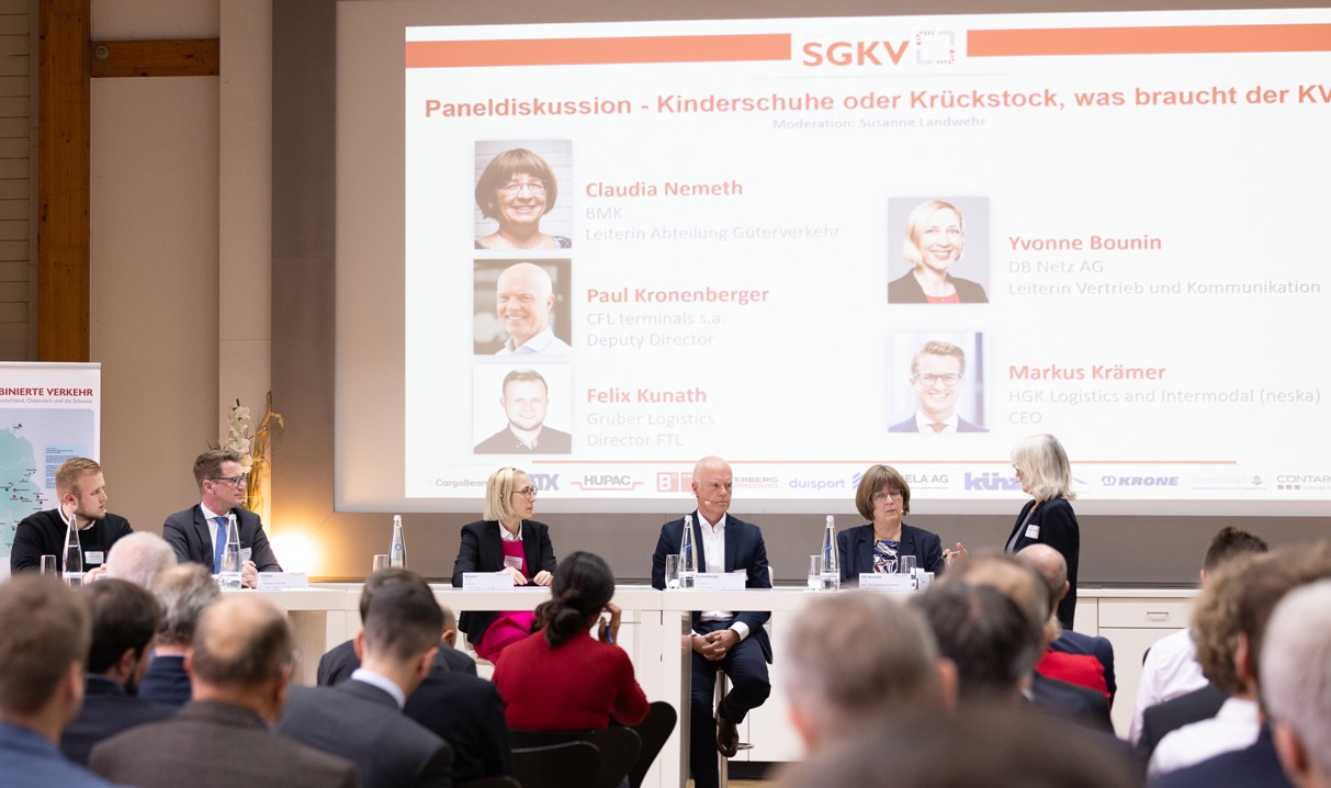 Die zentrale Paneldiskussion unter Beteiligung von Claudia Nemeth (BMK), Felix Kunath (Gruber Logistics), Markus Krämer (HGK Logistics and Intermodal), Yvonne Bounin (DB Netz), Paul Kronenberger (CFL Terminals) und Moderatorin Susanne Landwehr thematisierte die aktuellen Herausforderungen und Ausblicke für den KV. Diese betreffen insbesondere den zunehmenden Preisdruck auf Schiene und KV, die zunehmende Relevanz des Themas Klimaschutz/ CO2-Einsparung und die Zuverlässigkeit und Infrastrukturkapazitäten im Netz, auch vor dem Hintergrund der anstehenden Korridorsanierung ab Mitte 2024. Die Paneldiskutanten waren sich einig: trotz vieler Hürden ist der KV ein zentraler Baustein für die Erreichung der Klimaziele im Verkehr, welcher besondere Aufmerksamkeit und gemeinsame Anstrengungen erfordert.