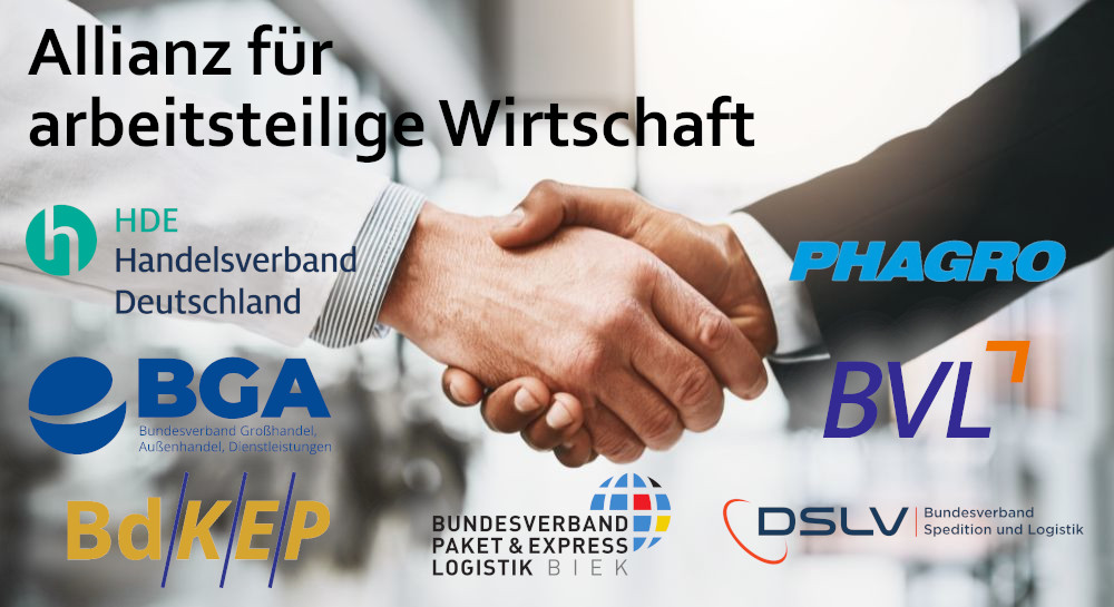 Nein zum Vertragspartnerverbot – dafür setzt sich die Allianz für arbeitsteilige Wirtschaft ein, in der sich die führenden Wirtschaftsverbände Bundesverband Großhandel, Außenhandel, Dienstleistungen (BGA), Bundesverband der Kurier-Express-Post-Dienste (BdKEP), Bundesverband Paket und Expresslogistik (BIEK), Bundesverband des pharmazeutischen Großhandels (PHAGRO), Bundesverband Spedition und Logistik (DSLV), Bundesvereinigung Logistik (BVL) und der Handelsverband Deutschland (HDE) zusammengeschlossen haben.