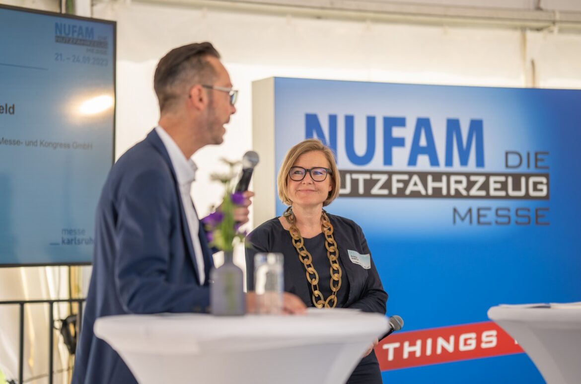 Foto: © Benedikt Spether/Messe Karlsruhe / Bildlegende: Jochen Bortfeld (links), Projektleiter der NUFAM, und Britta Wirtz, Geschäftsführerin der Messe Karlsruhe, gaben beim Media Day einen Ausblick auf die Nutzfahrzeugmesse im September.