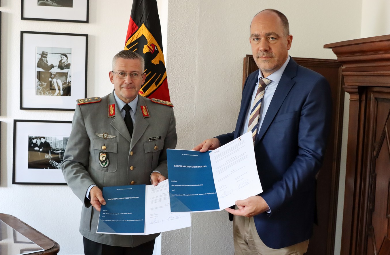 Der Präsident des Bundesamts für Logistik und Mobilität (BALM), Christian Hoffmann, sowie der Stellvertreter des Befehlshabers des Operativen Führungskommandos der Bundeswehr und Kommandeur Territoriale Aufgaben, Generalleutnant André Bodemann, unterzeichneten am 14. Juli 2025 eine Kooperationsvereinbarung zur Stärkung der Verteidigungsfähigkeit Deutschlands.