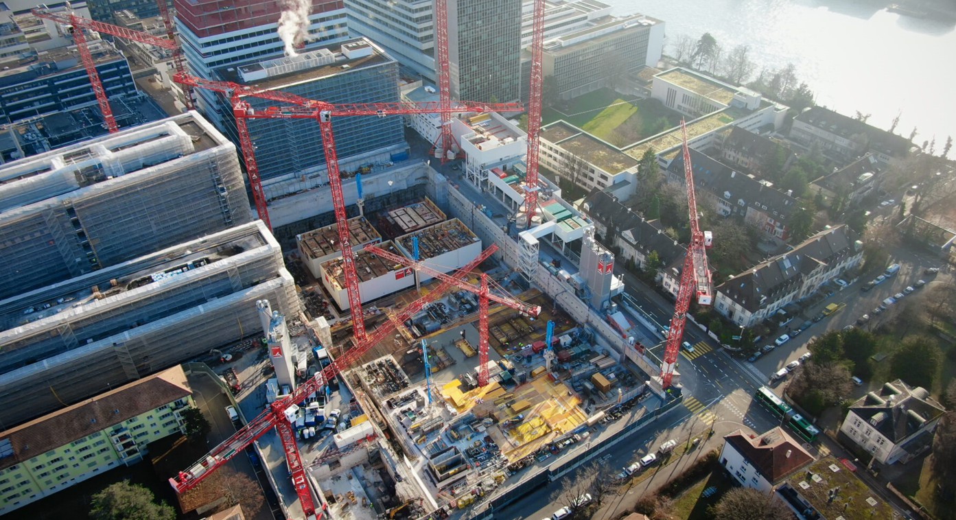 Neben dem Rückbau der Bestandsgebäude, und der Gewinnung von 180`000 Tonnen recyclingfähigem Abbruchmaterial konnte im April 2019 mit den Bauarbeiten am pRed Center begonnen werden. Das Bauvorhaben bestand aus einer Tiefgarage mit 6 Untergeschossen, sowie einem Konferenzzentrum über 5 Stockwerke, einem neuen Headquarter über 6 Stockwerke sowie den beiden Laborhochhäusern mit 16 und 26 Stockwerken mit einem Bauvolumen von 605`000 m3, inmitten eines Wohnquartiers. Erschwerend kommt hier der laufende Betrieb der F. Hoffmann-La Roche AG zum Tragen, der nicht einschränkbar ist und über die gleichen Logistikwege wie die Baustelle versorgt werden muss.