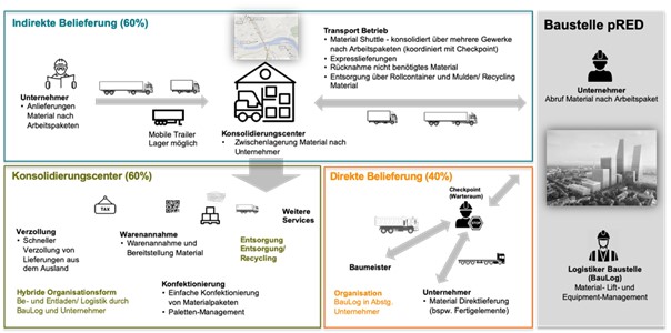Durch die Bündelung der Transporte und die Kommissionierung von Waren kann die Logistik nicht nur zielgerichtet Fahrzeugbewegungen einsparen, sondern auch termingerecht an die Verwendungsstelle liefern und somit Wartezeiten vermeiden. Die durch die Logistik zentral gesteuerte Abladeverfahren, die horizontal und vertikal durchgeführten Materialverbringungen führen zu einer grossen Entlastung der Bauunternehmen im Materiallieferprozess. Diese können ihre sonst aufzuwendenden Logistikzeiten für wertschöpfende Tätigkeiten einsetzen und somit positive Effekte in Richtung Bauzeitverkürzung erzielen.
