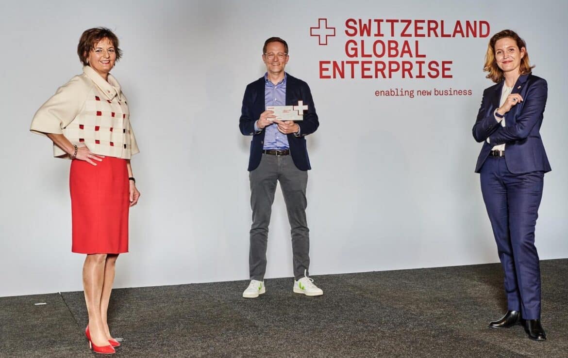 Foto: © Switzerland Global Entreprise / Bildlegende: Ruth Metzler-Arnold, Verwaltungsratspräsidentin von S-GE (links), Thomas Bechter, CEO Berlinger (Mitte) und Simone Wyss Fedele, CEO S-GE (rechts) freuen sich über die Verleihung des Export Award 2020