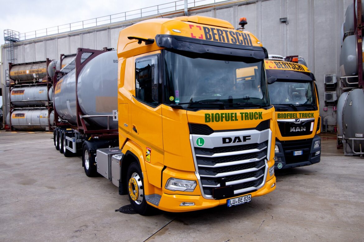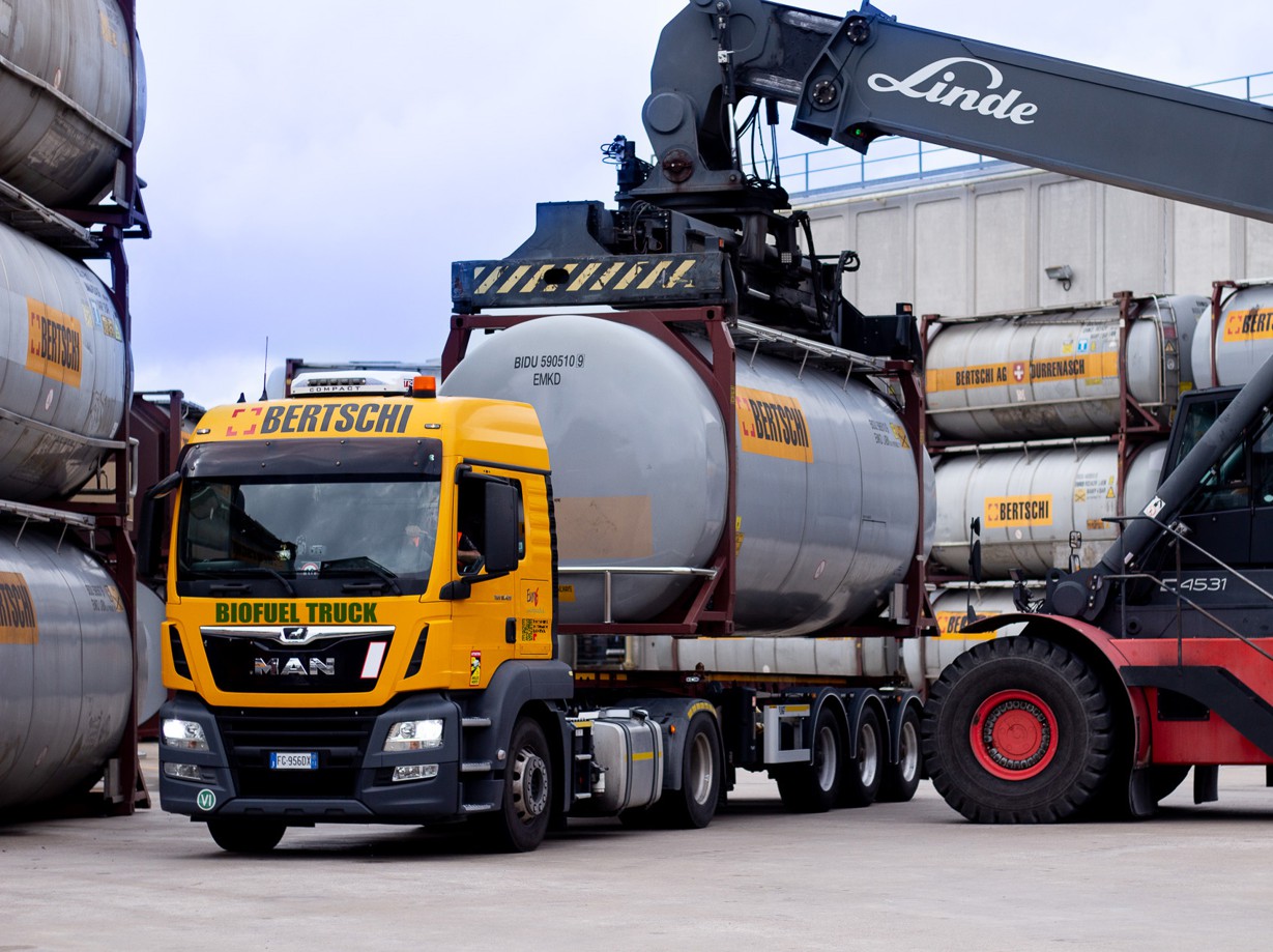 (Dürrenäsch/Horgen) Bertschi, der Marktführer in der intermodalen Chemielogistik in Europa, arbeitet kontinuierlich an Strategien zur Verbesserung der Nachhaltigkeit seiner Tür-zu-Tür Transportlösungen. Heute wickelt Bertschi 90% aller europäischen Landtransporte über den intermodalen Schienenverkehr ab und reduziert damit die CO2-Emissionen um 230’000 Tonnen pro Jahr. Der Schwerpunkt der Anstrengungen liegt dabei auf der Optimierung der ersten und letzten Meile der Lieferkette, welche auf der Strasse abgewickelt wird. Hydriertes Pflanzenöl (HVO) erweist sich hier als wertvoller Ersatz für herkömmlichen Diesel.