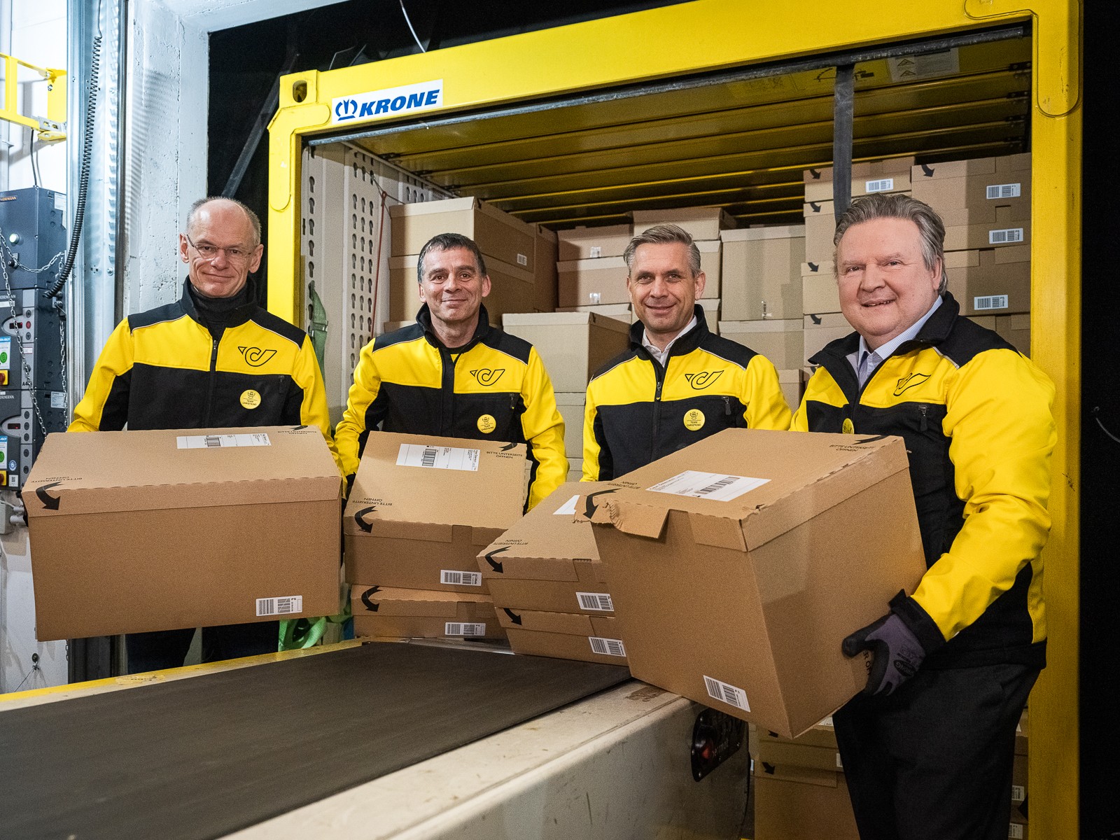 Posieren für die Kamera (v.l.n.r.): Walter Oblin, Generaldirektor, Österreichische Post AG, Peter Umundum, Generaldirektor-Stellvertreter, Vorstand für Paket & Logistik, Österreichische Post AG, Wolfgang Hattmannsdorfer, Bundesminister für Wirtschaft, Energie und Tourismus, und Michael Ludwig, Bürgermeister der Stadt Wien