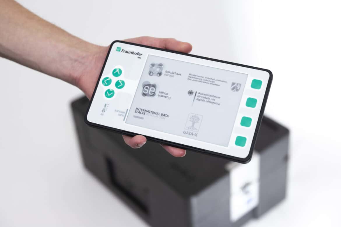 Das »Blockchain Device« ist eine vollständige Neuentwicklung, angefangen bei der Computer-Hardware über die Software des Temperatursensors bis zum Blockchain Client. Nur 9 mm hoch, kann es wie eine Einsteckkarte in einen Standardbehälter eingesteckt werden. Es verfügt über 5G-kompatible Kommunikation, ein hochauflösendes ePaper-Display (1440 x 1072 Pixel) und eine Reihe von Sensoren (Temperatur, Beschleunigung, Lage). Die Akkulaufzeit beträgt im Dauerbetrieb mehr als 14 Tage und im Low-Power-Betrieb mehr als zwei Jahre.