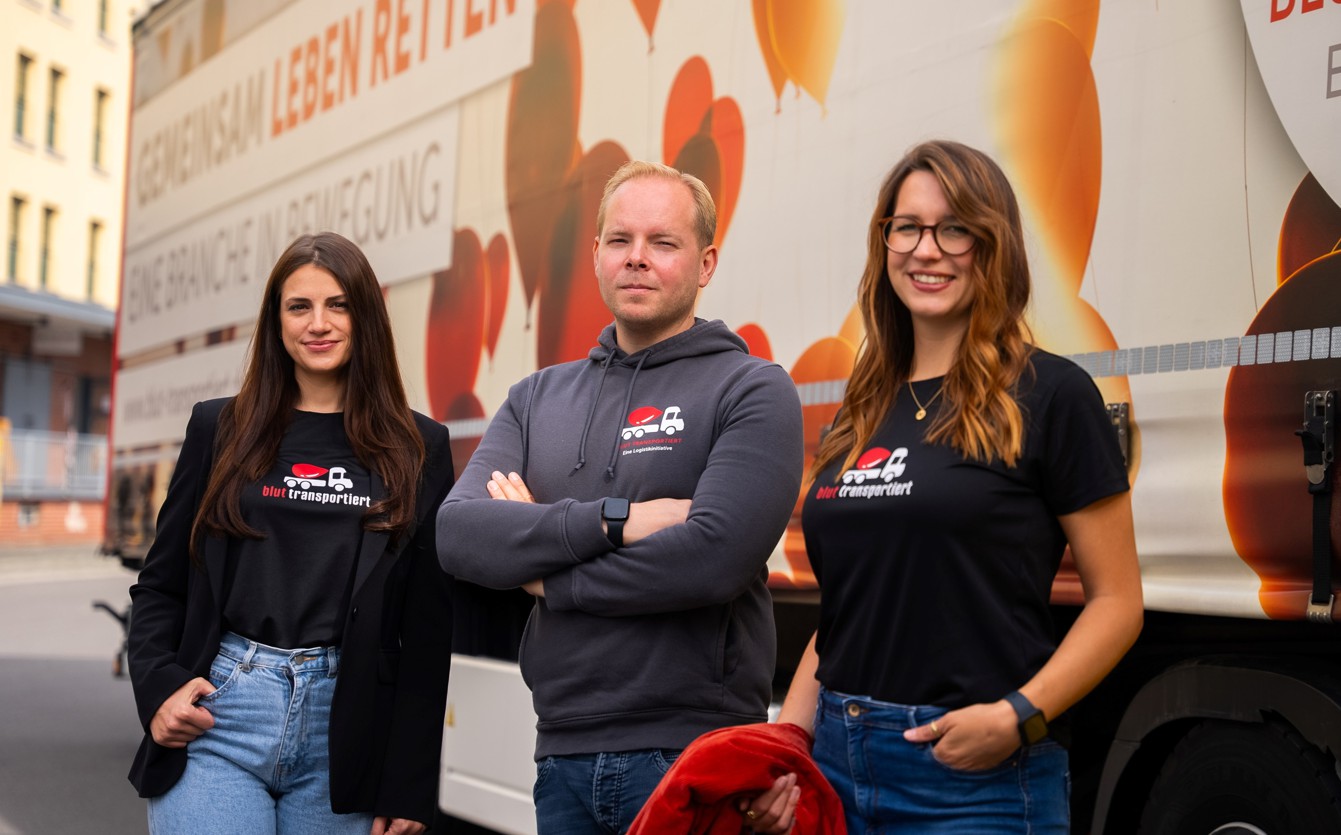 Foto: © Blut transportiert e.V. / Bildlegende: Vorstandsvorsitzender von Blut transportiert e.V. Nicolas Gallenkamp (mittig) und die Projektleitung Susanne Foitzik (links) und Nina Konerding (rechts)