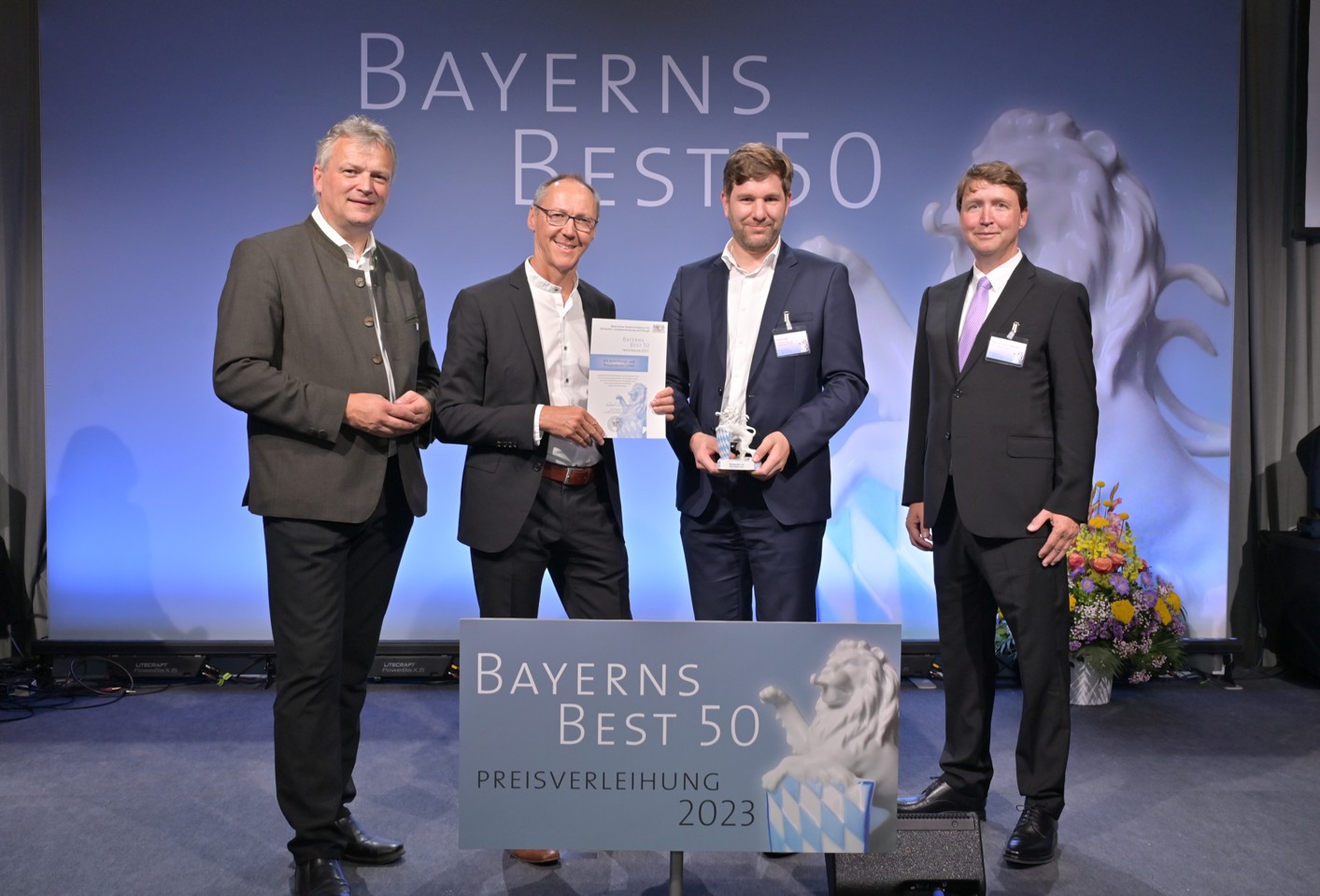 Foto: © StMWi/Fotostudio Heuser / Bildlegende (v.l.n.r.): Wirtschaftsstaatssekretär Roland Weigert mit BTK-Geschäftsführung Franz Weiß und Josef Heiß sowie Marcus von Goldacker (Geschäftsführer Mazars GmbH)