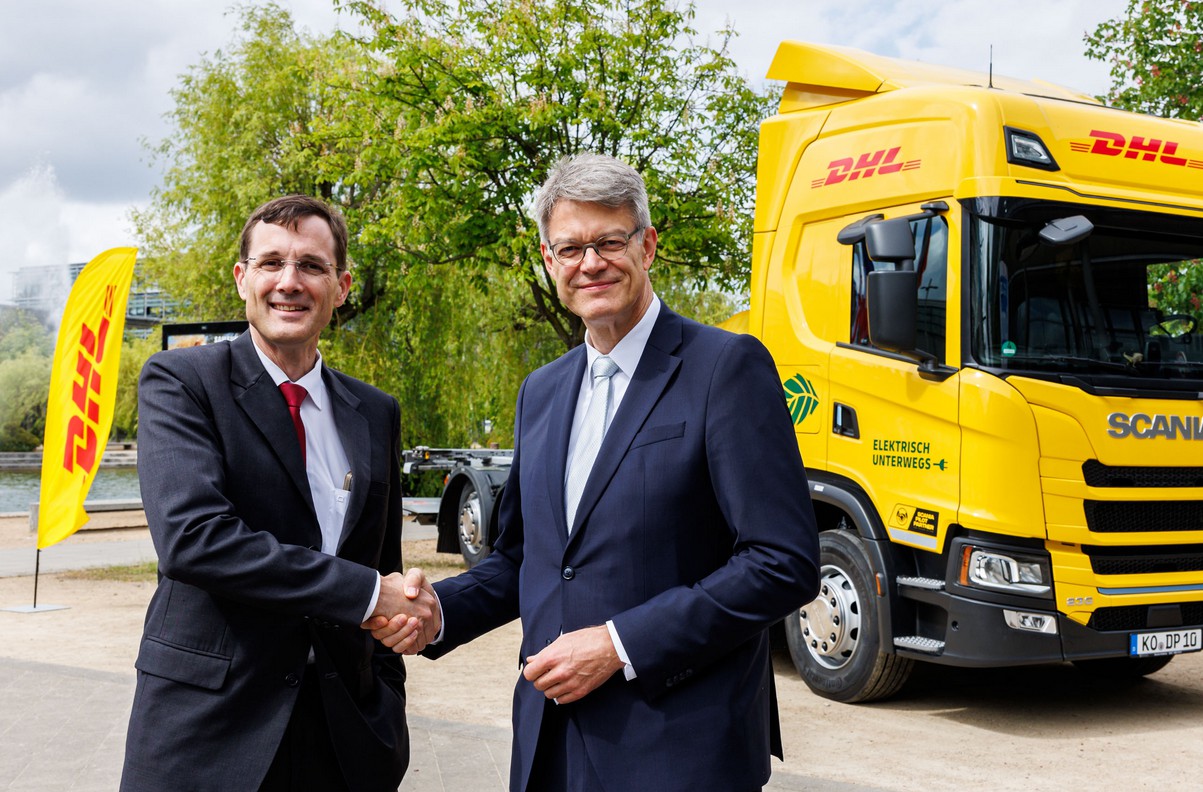 Zur Eröffnung der diesjährigen transport logistic wird Bundesverkehrsminister Patrick Schnieder (rechts, neben DHL-CEO Tobias Meyer bei der Premiere eines Hybrid-LKW von Scania) erwartet © DHL/Jens Schlueter