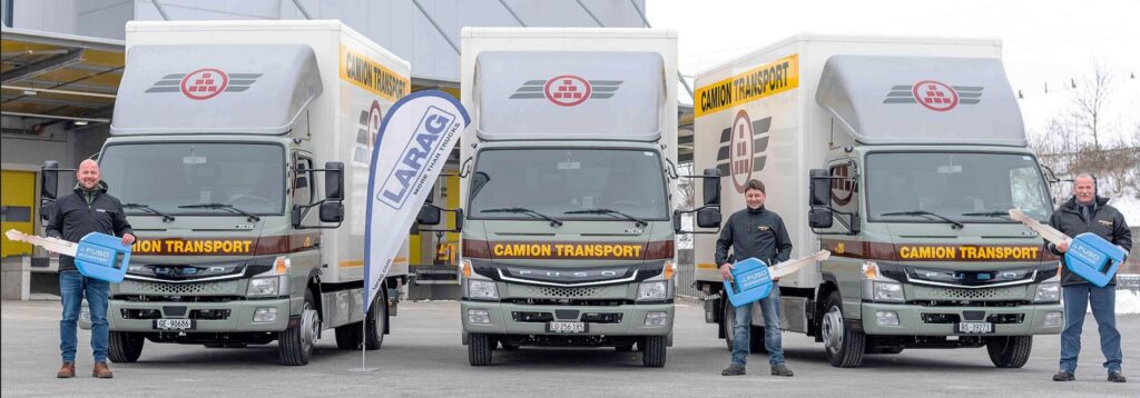 Seit wenigen Tagen zählen drei vollelektrische FUSO eCanter zur Fahrzeugflotte der schweizerischen Camion Transport AG. Die drei Fahrzeuge kommen in den Städten Basel, Luzern und Genf in der City-Logistik im Einsatz. Die Schlüsselübergabe fand im kleinen Rahmen in Rümlang (bei Zürich) statt. Es sind die ersten eCanter, die in der Schweiz zum Einsatz kommen.