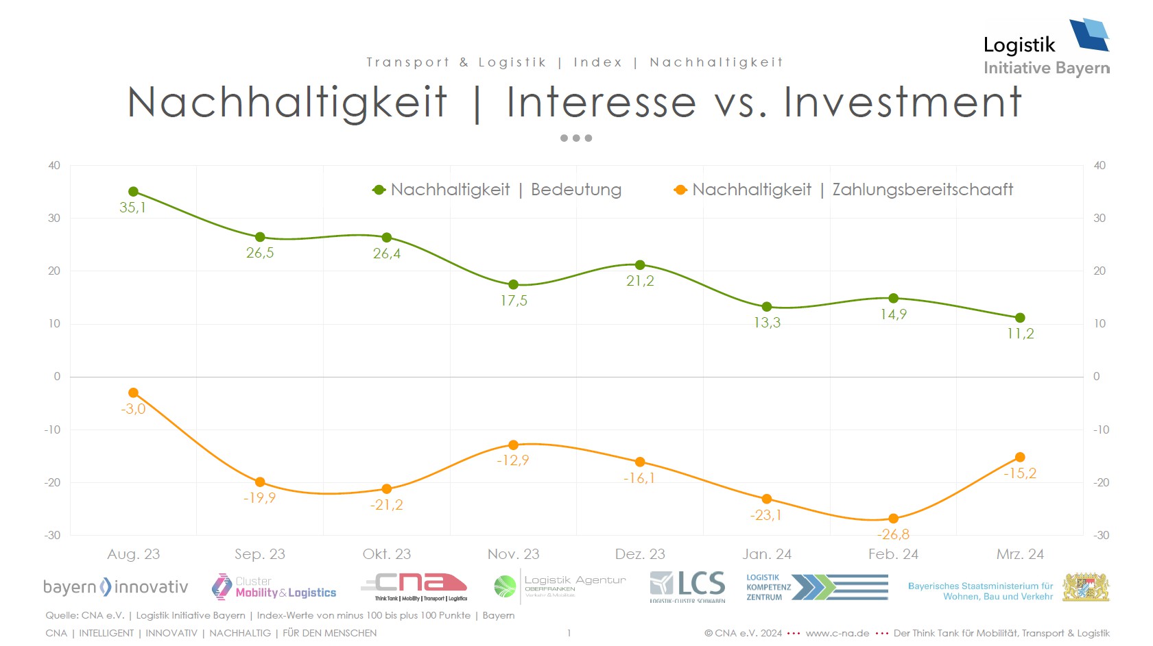 Der Nachhaltigkeits-Index wird im Rahmen des Logistik Barometer Bayern ermittelt. Die Experten-Befragung der bayerischen Transport- und Logistikbranche hatte bereits in den vergangenen acht Monaten die Experten-Einschätzung zur Bedeutung von wie auch zur Zahlungsbereitschaft für das Thema abgefragt. „Der Nachhaltigkeits-Index der vergangenen Monate zeigt deutlich, dass angesichts wirtschaftlicher Herausforderungen wie etwa der Anhebung der CO2-Preise zum Jahresbeginn auch die Wichtigkeit des Themas Nachhaltigkeit in Transport und Logistik zurückgeht.“, merkt Dr. Rudolf Aunkofer | Geschäftsführer CNA e.V. an „Leider lässt sich verfolgen, was aus anderen Kontexten bereits bekannt ist: eine hohe Kostenbelastung lässt Wirtschaftlichkeit bzw. Wettbewerbsfähigkeit bei Unternehmen wie Kunden in den Vordergrund treten, leider zulasten von Nachhaltigkeit. Höhere Kostenbelastung wie u.a. die LKW-Maut kann somit erstmals auch zu gegenläufigen Effekten in der Praxis führen. Die Vision einer Grünen Logistik muss bezahlbar bleiben.“