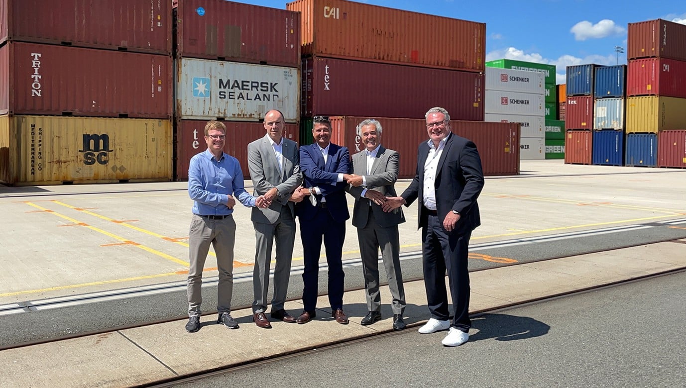 Foto: © Contargo / Bildlegende: (v.l.n.r.) Christian Epple, Manager Business Development & Projects Contargo, Jürgen Albersmann, Geschäftsführer Contargo / Andreas Stolte Geschäftsführer DeltaPort / Dieter Thurm, Technischer Leiter DeltaPort / Sascha Noreika, Geschäftsführer Contargo Rhein-Waal-Lippe