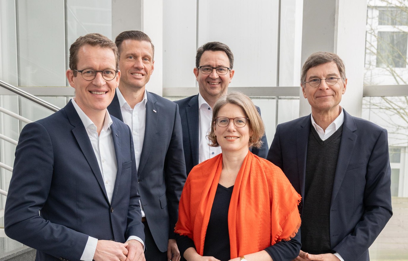 Foto: © Fraunhofer IML, Frederic Eynck / Bildlegende (v.l.n.r.): Burkhard Eling (CEO Dachser SE), Alexander Tonn (COO Road Logistics Dachser SE), Stefan Hohm (CDO Dachser SE), Prof. Alice Kirchheim (Institutsleiterin Fraunhofer IML), Prof. Stefan Wrobel (Institutsleiter Fraunhofer IAIS)