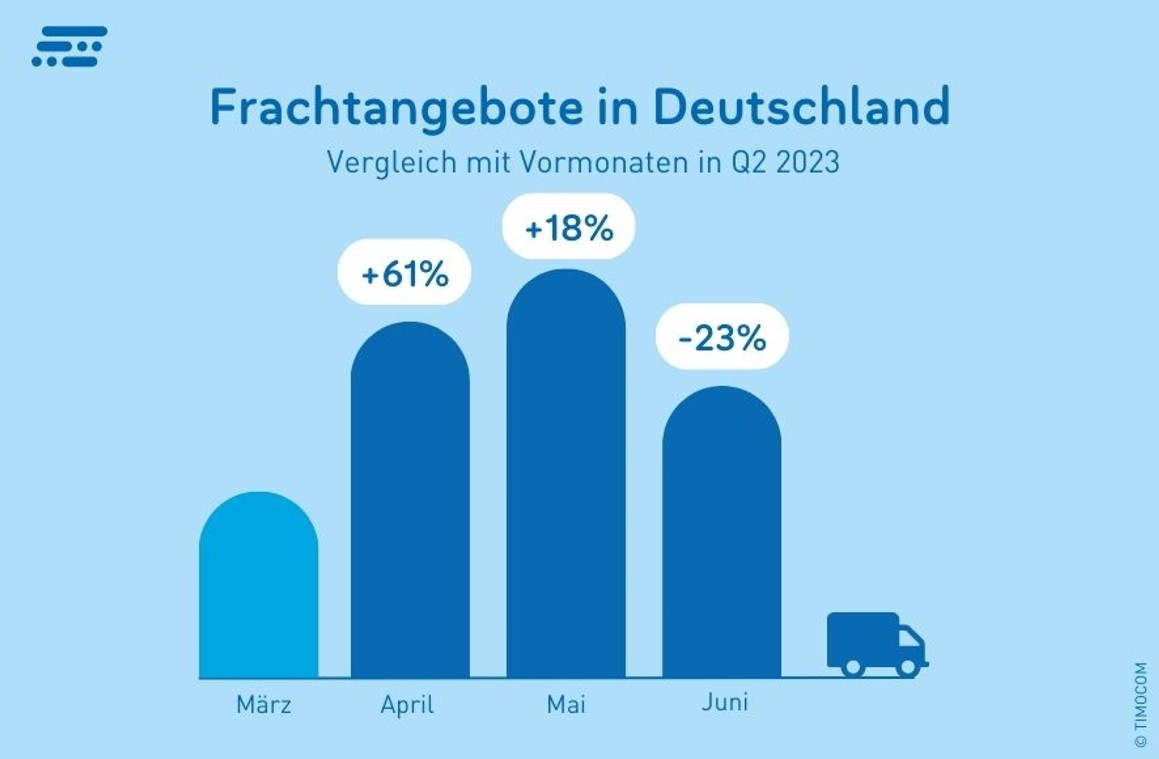 (Erkrath) Nach schwachem Start im ersten Quartal zeichnete sich zunächst im zweiten Quartal eine Steigerung der Transportnachfrage ab. Entgegen des laut ifo-index sinkenden Geschäftsklimas wurden europaweit im April 40% mehr Frachtangebote und innerhalb Deutschlands 61% mehr Frachten im Spotmarkt eingestellt als noch im März 2023. Im Mai kamen in Deutschland nochmals 18% mehr Frachtangebote im Vergleich zum Vormonat hinzu, europaweit war es ein Plus von 8%. Insgesamt gab es durch das Hoch Anfang Q2 57% mehr Frachtangebote im Marktplatz von TIMOCOM als im Vorquartal.