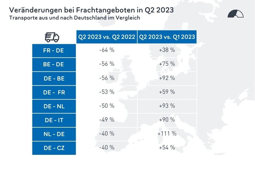 Seit Juni ist europaweit ein Abwärtstrend bei der Anzahl der Frachtangebote aufgrund der traditionell schwachen Sommermonate zu erkennen, die zudem auf eine abflauende Konjunktur treffen. Im Juni fielen die Frachteingaben europaweit um 15% im Vergleich zum Vormonat.