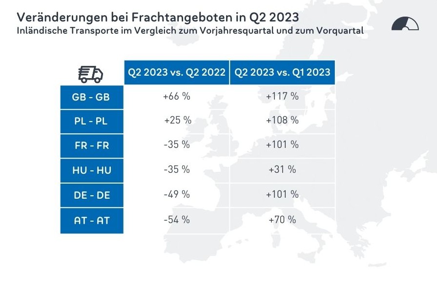 Während Großbritannien und Polen ihre Nachfrage nach Binnentransporten deutlich steigern konnten, verlief die Entwicklung u.a. in Deutschland und Frankreich sowie in Österreich und Ungarn rückläufig gegenüber dem zweiten Quartal 2022. Im Vergleich zum ersten Quartal 2023 waren aber klare Zuwächse bei Frachtangeboten zu erkennen. Ein Grund: Während Frankreich und Deutschland im zweiten Quartal 2022 außergewöhnliche Zuwächse an Frachtangeboten aufgrund des Nachholeffekts aus der Coronazeit hatten, fielen diese in Großbritannien und Polen damals nicht so stark aus. Deshalb konnten jetzt diese Steigerungen von 66% bzw. 25% im Vergleich zum Vorjahresquartal erreicht werden. Auf den Inlandstransporten in Österreich (AT-AT -54%) und Deutschland (DE-DE -49%) sowie in Frankreich (FR-FR -35%) und Ungarn (HU-HU -35%) konnten trotz der Steigerungen in Q2 2023 gegenüber dem ersten Quartal die außergewöhnlichen Vorjahreswerte nicht wieder erreicht werden.