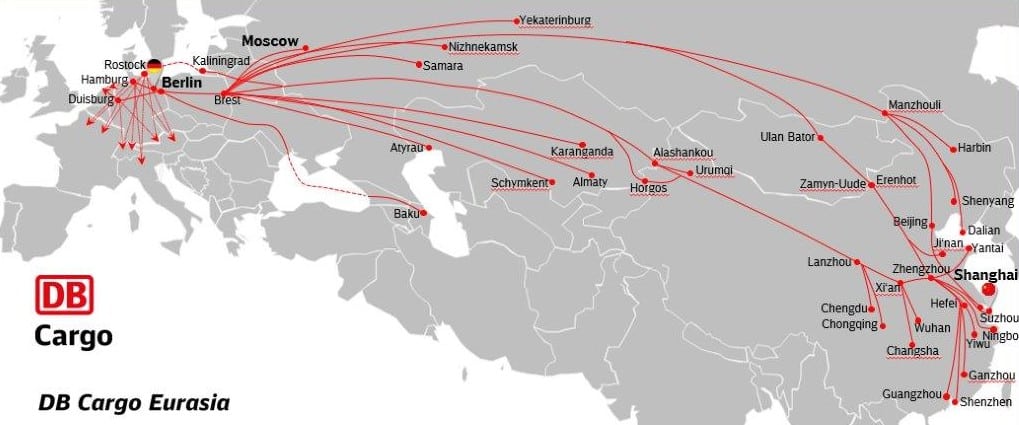Das DB-Unternehmen hat in diesem Jahr mehrere neue Strecken zwischen China und Europa eröffnet, zuletzt Ende September die neue Verbindung Shanghai – Hamburg – Shanghai. Über mehr als zehn Routen wickelt DB Cargo Eurasia aktuell den Verkehr ab.