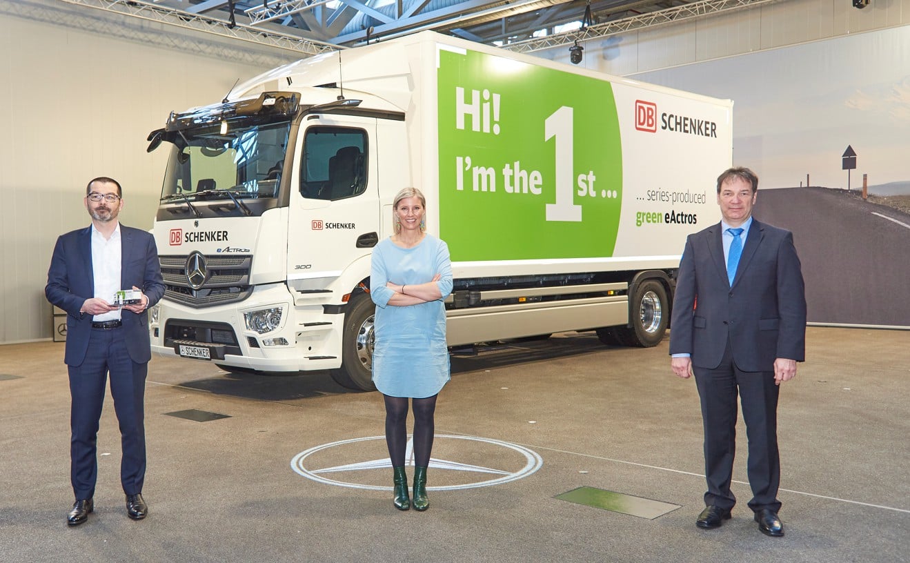 Mercedes-Benz Lkw: „Wir freuen uns sehr, dass DB Schenker als eines der führenden Unternehmen der Logistikbranche auf den Mercedes-Benz eActros setzt. Bei der Entwicklung des eActros haben wir eng mit DB Schenker zusammengearbeitet. So sind die Rückmeldungen aus der Betriebspraxis direkt in das Serienprodukt und den dazugehörigen Serviceangeboten eingeflossen. Der eActros ist ein echter Mercedes und das richtige Fahrzeug für eine neue, nachhaltige Ära.“