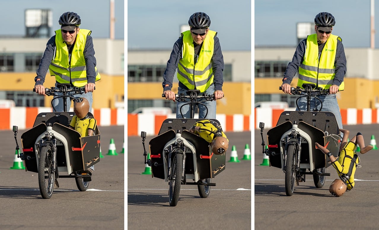 Im DEKRA Technology Center am Lausitzring in Brandenburg testeten die Experten die verschiedenen Szenarien mit einem Kinder-Dummy. Im einen Fall war der Dummy mit dem vom Hersteller angebotenen Anschnallsystem gesichert, im anderen Fall saß er nicht angeschnallt auf dem Sitz in der Cargo-Box. Gebremst wurde mit der fahrradeigenen Bremse aus 25 km/h.