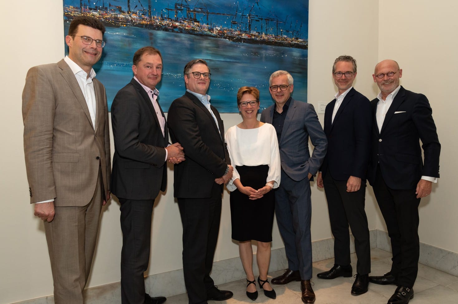 Foto: © Hafen Hamburg Marketing e.V. / Bildlegende: (v.l.n.r.) Lutz Könner (Zentalverband der deutschen Seehafenbetriebe e.V.), Kay Lohse (Deutsches Seeverladerkomitee im Bundesverband der Deutschen Industrie e.V.), Dr. Alexander Geisler (Verband Hamburger und Bremer Schiffsmakler e.V.), Dr. Claudia Schilling (Senatorin für Wissenschaft und Häfen der Freien Hansestadt Bremen), Oliver Detje (DVV Media Group GmbH), Dr. Berend Lindner (Staatssekretär Niedersächsisches Ministerium für Wirtschaft, Arbeit, Verkehr und Digitalisierung) Michael Westhagemann (Präses der Behörde für Wirtschaft und Innovation Freie und Hansestadt Hamburg)