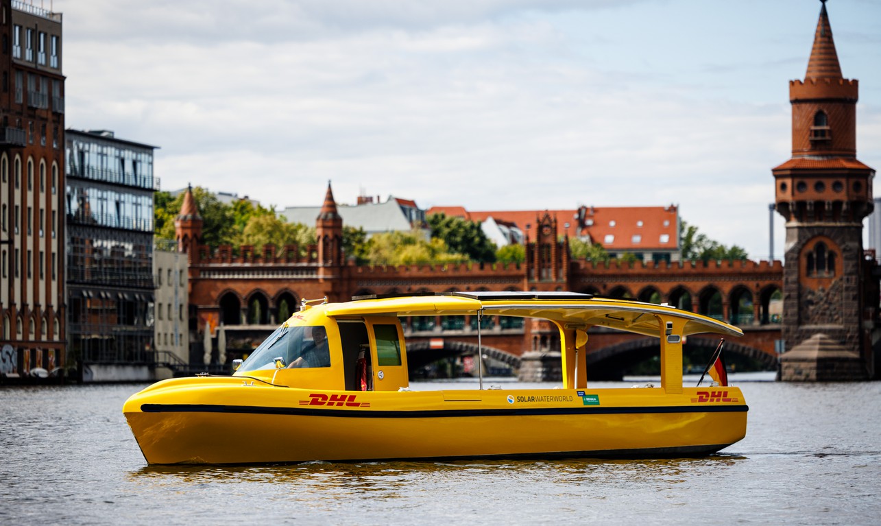 Seit Oktober 2022 transportiert DHL mit dem elektrisch angetriebenen Solarschiff täglich bis zu 350 Sendungen auf der Spree und der Havel vom Südhafen Spandau bis zum Westhafen. Bei dem deutschlandweit ersten Pilotprojekt dieser Art werden keine Emissionen verursacht. Das Solarschiff fährt umweltschonend und geräuschlos. Vom Westhafen aus bringt DHL die Pakete dann weiter umweltfreundlich zu den Kunden – mit elektrischen Lastenrädern.