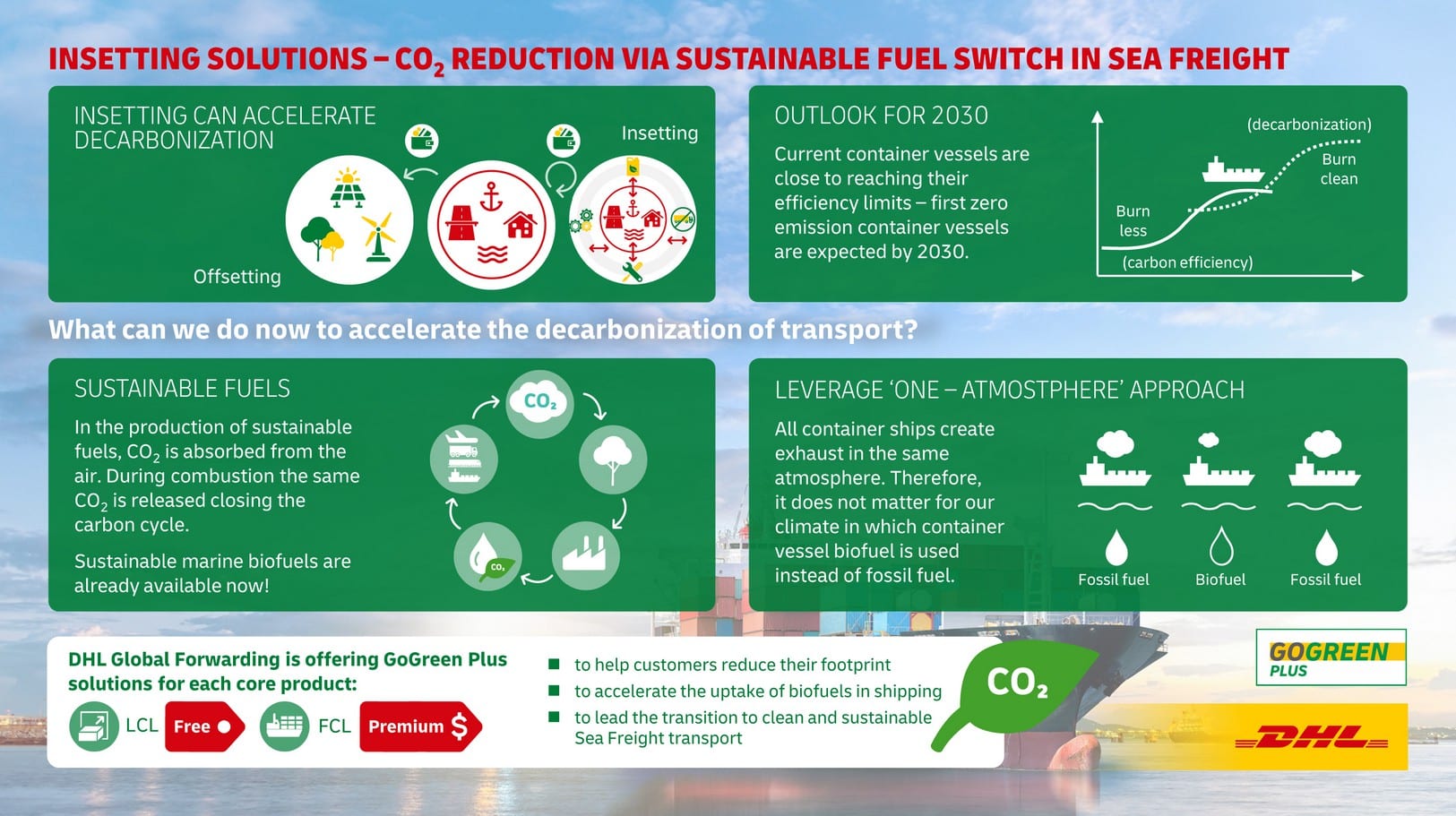 Mit GoGreen Plus bietet DHL seinen Kunden verschiedene Optionen zur Minimierung logistikbezogener Emissionen und anderer Umweltauswirkungen entlang der gesamten Lieferkette. Auf diese Weise werden CO2-Emissionen in der Luft- und Seefracht verringert, und die übrige Lieferkette wird durch einen Emissionsausgleich über den gesamten Lebenszyklus klimaneutral gestaltet. Das Produktangebot GoGreen Plus ist Teil des mittelfristig bis 2030 angelegten Nachhaltigkeitsfahrplans des Unternehmens und unterstützt das Teilziel, mindestens 30 Prozent des Kraftstoffbedarfs durch nachhaltige Kraftstoffe zu decken. Zur Reduzierung der CO2-Emissionen im Sinne des Pariser Klimaabkommens wird der Konzern bis zum Jahr 2030 7 Milliarden Euro für nachhaltige Kraftstoffe und saubere Technologien ausgeben.