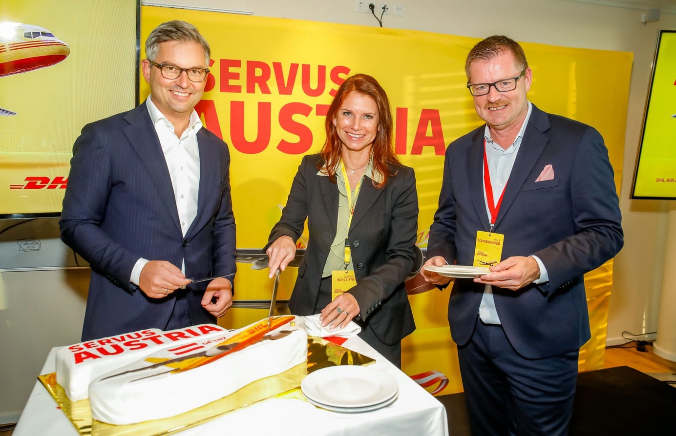 Cake Cutting mit Dr. Magnus Brunner, Staatssekretär für Luftfahrt; Barbara Achleitner, Managing Director der DHL Air Austria und Ralf Schweighöfer, CEO von DHL Express Austria (© Christian Husar)