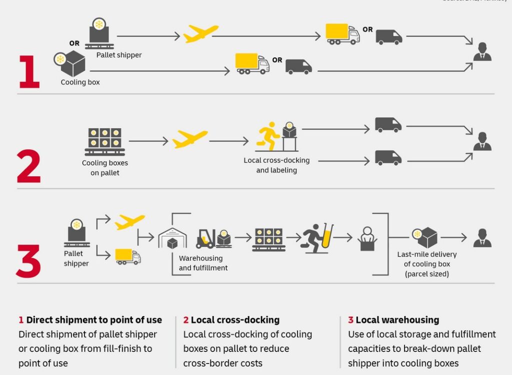 Aktuell werden über 250 mögliche Impfstoffe auf sieben Forschungsplattformen entwickelt und getestet. Da im Fall von COVID-19-Impfstoffen Studienphasen teilweise übersprungen wurden, werden an bestimmte Medikamente möglicherweise besonders strenge Temperaturanforderungen von bis zu -80°C gestellt, um ihre Wirksamkeit während des Transports und der Lagerung zu erhalten. Dies bedeutet für bestehende medizinische Versorgungsketten ganz neue logistische Herausforderungen, da üblicherweise die Distribution von Impfstoffen bei einer Temperatur von circa 2 bis 8°C erfolgt. In der Studie untersucht DHL, wie dieser Transport von hoch-temperaturempfindlichen Impfstoffen effektiv gestaltet werden kann, um den Kampf gegen die weitere Ausbreitung des Virus zu unterstützen. Um eine weltweite Versorgung mit COVID-19-Impfstoffen sicherzustellen, werden in den unterschiedlichen Lieferketten rund 200.000 Paletten-Transporte, 15 Millionen Lieferungen in Kühlboxen sowie 15.000 Flüge erforderlich sein.