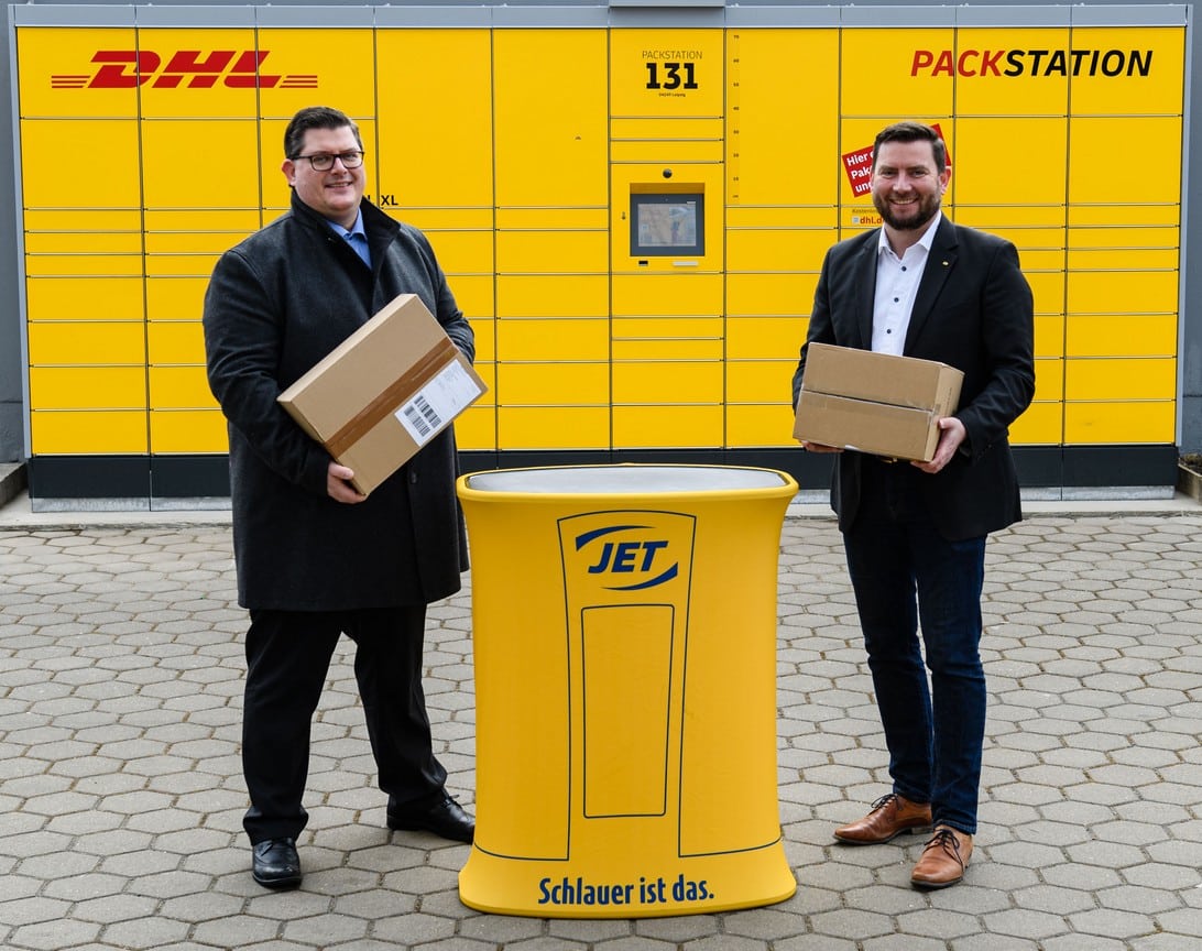 (Bonn, Hamburg) Fast alle der mehr als 680 JET Tankstellen in Deutschland sollen künftig eine DHL Packstation erhalten. Damit können Kunden bei JET auch ganz bequem ihre Pakete abholen und versenden – und das rund um die Uhr. Die erste Packstation der neuen Kooperation nahmen JET und die Deutsche Post DHL Group heute offiziell in Leipzig in Betrieb. „Wir freuen uns, dass wir mit JET einen neuen starken Partner an Bord haben, damit unsere Kunden an vielen weiteren attraktiven Standorten ihre Pakete unkompliziert mit der Packstation empfangen und versenden können“, erklärt Bernd Franken, Key Account Manager Post & Paket Deutschland der Deutsche Post DHL Group. Allein an bis zu 300 JET Standorten wird noch in diesem Jahr auf dem Außengelände eine Packstation aufgebaut.