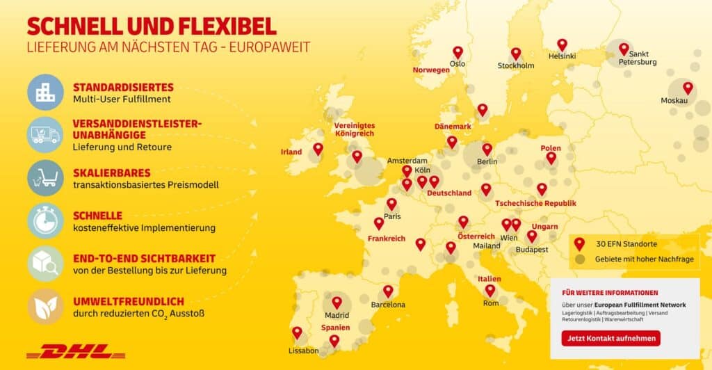 DHL Supply Chain bietet den Marktpartnern im E-Commerce ein dichtes europäisches Fulfillment-Netzwerk an. Der Serviceumfang lässt sich modular und bedarfsgerecht nach Regionen und Ländern zuschneiden und an die Auftragslage des Kunden anpassen und skalieren. Bei Kunden des Netzwerkes konnten zudem deutliche Kostensenkungen bei gleichzeitig schnelleren Lieferzeiten realisiert werden.