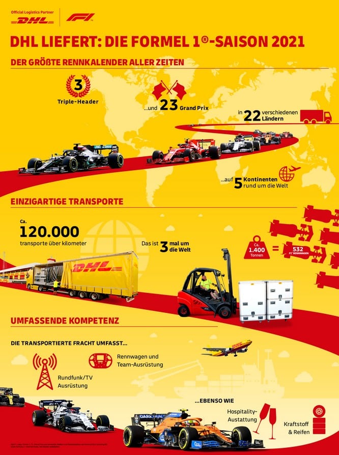 (Bonn) Kurz vor dem Start in die neue FIA Formel-1®-Weltmeisterschaft freuen sich DHL und Formel 1®, die Verlängerung ihrer langjährigen Partnerschaft bekanntzugeben. DHL bleibt somit für die nächsten Jahre offizieller Logistikpartner der Formel 1® und verantwortet weiterhin den Transport der Königsklasse des Motorsportes rund um die Welt. In 2021 stehen mit 23 Grand Prix so viele wie niemals zuvor im Rennkalender der Formel 1®. Zu den weltweit ausgetragenen Rennen transportiert DHL beispielsweise die Rennwagen, das Equipment der Teams, Öl und Kraftstoffe sowie die Übertragungstechnik. Bereits seit 2004 ist DHL offizieller Logistikpartner und hat seitdem ausnahmslos jedes „Rennen hinter dem Rennen“ für eine planmäßige Austragung der Formel 1® auf den Grand Prix Rennstrecken in aller Welt gewonnen.