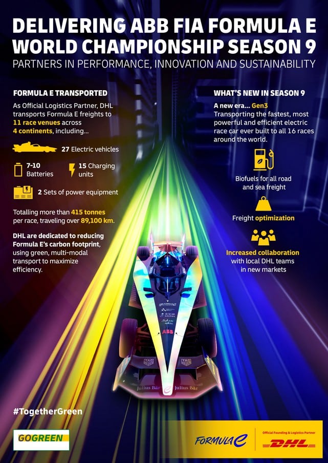Die Partnerschaft mit DHL bietet der Formula E modernste, nachhaltige Logistikleistungen mit maßgeschneiderten multimodalen Transportlösungen auf dem Land- und Seeweg, die für maximale Effizienz und minimale CO2-Emissionen sorgen. Unter Einsatz von Biokraftstoffen auf der Straße und zur See wird DHL in der kommenden Saison über 89,000 Kilometer zurücklegen und für jedes Rennen rund 415 Tonnen an wertvoller Fracht transportieren, darunter Rennwagen, Batterien, Ladeeinheiten, Übertragungsequipment sowie Marketing- und Hospitality-Ausrüstung.
