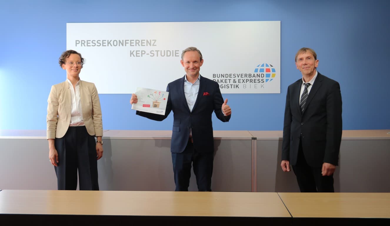 Foto: © BIEK / Bildlegende: v. l. Sarah Neumeyer (Pressestelle, Bundesverband Paket und Expresslogistik), Marten Bosselmann (Vorsitzender, Bundesverband Paket und Expresslogistik), Dr. Klaus Esser (KE-CONSULT Kurte&Esser GbR, Autor der KEP-Studie 2020)