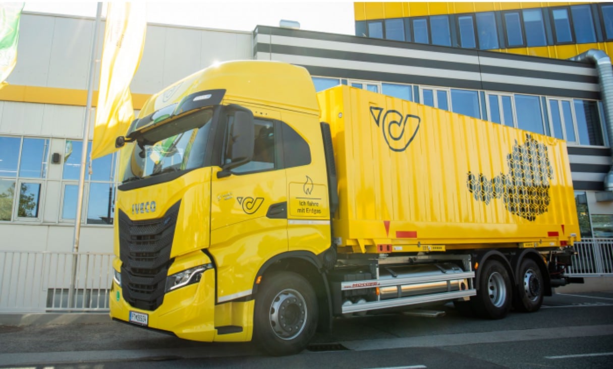 LNG-Lkw der Österreichischen Post vor dem Logistikzentrum in Wien-Inzersdorf