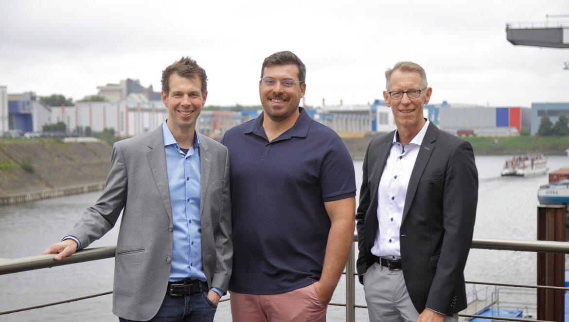 Foto: © Rheinports / Bildlegende: Der bisherige RheinPorts-Geschäftsführer Felix Harder (links) wird künftig zusammen mit Aurel Wernli und Joachim Holstein (rechts) die digitale Transformation der Binnenschifffahrt vorantreiben