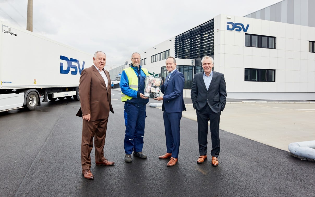 Foto: © DSV / (v.l.n.r.) Bildlegende: Erste Anlieferung: Klaus Fuchs, Director Operations DSV Solutions, Bart Peeters, Geschäftsführer DSV Solutions GmbH und Uwe Ernst, Standortleiter DSV Solutions Duisburg, begrüßen Fahrer Rob Bruggeman (2. v.l.) mit einem kleinen Willkommenspräsent in Duisburg.
