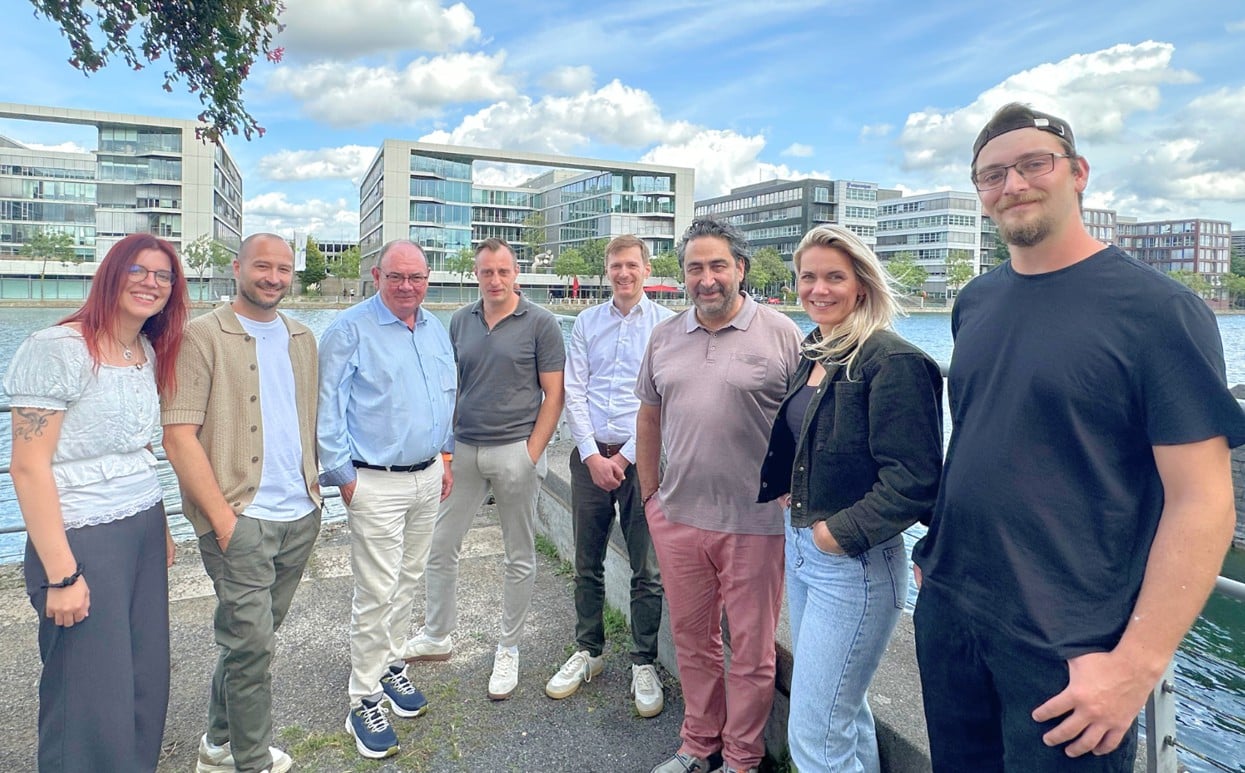 Foto: © DTG / Bildlegende: Die DTG beim Kick-Off mit startport im Innenhafen Duisburg (v. l. n. r.): Jessica Friedrich, Sebastian Werner, Andreas Grzib, Tobias Engels, Johannes Franke, Roberto Spranzi. Wiete Lukkezen, Hendrik van Aswege