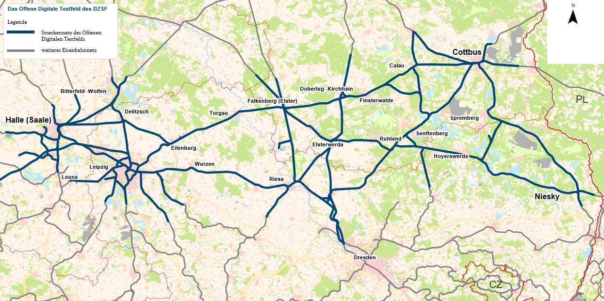 Das Offene Digitale Testfeld entsteht im Streckennetz zwischen Halle (Saale) – Cottbus – Niesky. Hier können neue Technologien und weitere Innovationen unter Realbedingungen erprobt werden. Das gilt beispielsweise für den Lärmschutz, den Umwelt- und Klimaschutz oder das automatisierte Fahren.