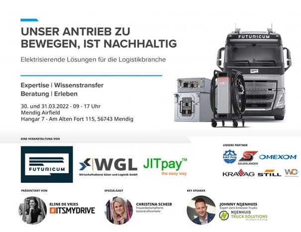 An einem spannenden Event präsentieren der Wirtschaftsdienst Güter und Logistik WGL, der Logistik-Zahlungsdienstleister JITpay und andere Partner die Elektro LKW-Marke Futuricum aus der Schweiz. Sozusagen E-Mobilität im Güterverkehr zum Anfassen, denn die Besucher erhalten auch Gelegenheit auf dem Flughafen in Mendig die LKW’s zu testen. Ebenfalls warten interessante Vorträge zum Thema an den zwei Ausstellungstagen am 30. und 31. März 2022 auf die Besucher.