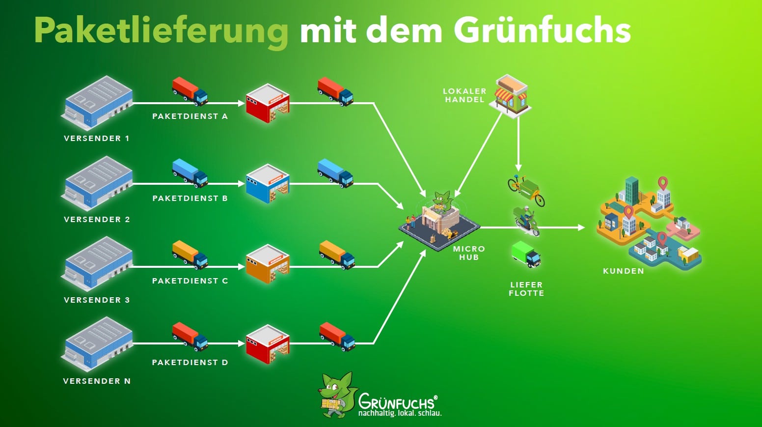 Der Grünfuchs bündelt externe KEP-Paketvolumen und kombiniert sie mit dem Warenverkehr des lokalen Einzelhandels. Mit Hilfe von digitalen, KI-basierten Tools inkl. einer volldynamischen Routenplanung und vollautomatischer Micro-Sortieranlage werden wir somit die Effizienzpotentiale auf der letzten Meile nachhaltig gehoben.