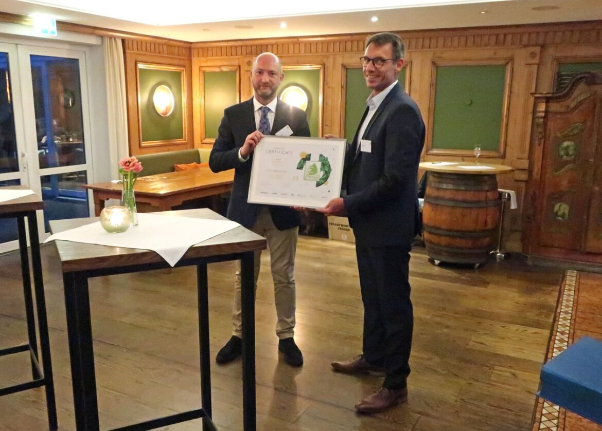 Titelbild: © Loginfo24 / Bildlegende: Peter Krummen (rechts, CEO Krummen Kerzers) nimmt voller Stolz von Jury-Mitglied und Laudator Stephan Koesling (CEO Office bei Toll Collect GmbH) die Siegesurkunde des Eco Performance Award entgegen.