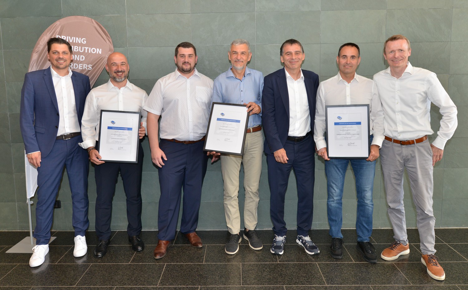 Foto: © Eurodis / Bildlegende: Die diesjährige Preisverleihung fand in Dubrovnik statt. Das Foto zeigt (von links): Jens Reibold, Geschäftsführer EURODIS GmbH, Ramazan Altinay, Leitung International Business, Business Development und Strategie bei Aras Kargo, Karel Bazala, Teamleiter Internationaler Kundendienst bei Express One Slowakei, Vlado Pencev, Operations Manager bei Express One Slowakei, Peter Umundum, Vorsitzender des EURODIS Beirats, Gergő Törőcsik, Verkaufsdirektor bei Express One Ungarn, Carsten Wallman, Executive Vice President CEE Parcel bei der Österreichischen Post.