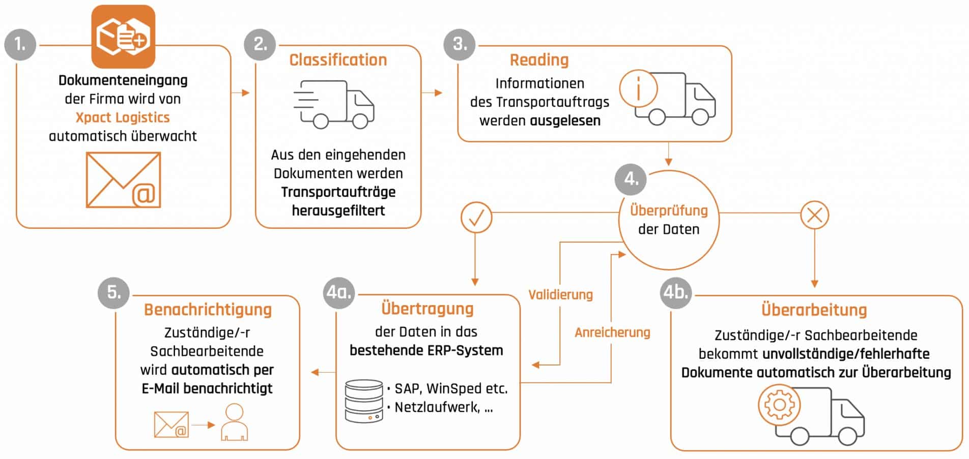 Im ersten Schritt des Workflows überwacht Xpact den Dokumenteneingang (z.B. E-Mail-Postfach) automatisch, klassifiziert die eingehenden Dokumente und filtert die Transportaufträge heraus. Alle weiteren Dokumente werden auf Wunsch in andere Abteilungen weitergeleitet oder bleiben von der Software unberührt. Nachfolgend liest die Software die gewünschten Informationen aus dem Transportauftrag heraus (z.B. Kundennummer, Gewicht, Größe etc.) und prüft sie auf Wunsch bzgl. Richtigkeit und Vollständigkeit.