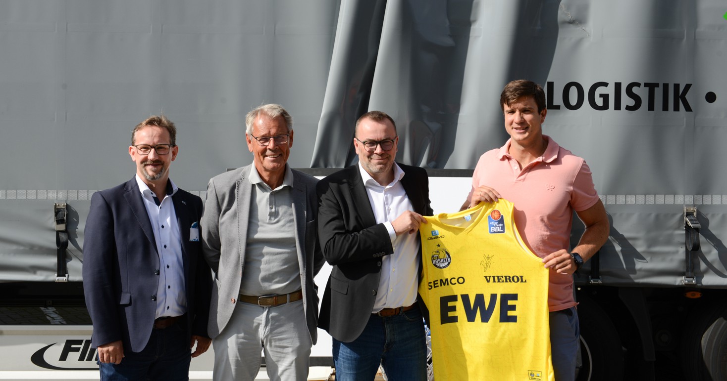Foto: © L.I.T. / Bildlegende: Ronald Arping, Vertriebsleiter Nord bei der L.I.T. Speditions GmbH, (links) und Simeon Breuer, Geschäftsführer L.I.T. Speditions GmbH sowie Vorstandsmitglied der L.I.T. AG, (2. von rechts) freuten sich über ein handsigniertes Baskets-Trikot, das Hermann Schüller, EWE-Baskets-Geschäftsführer, (2. von links) und Pedro Calles, Cheftrainer, (rechts) übergaben