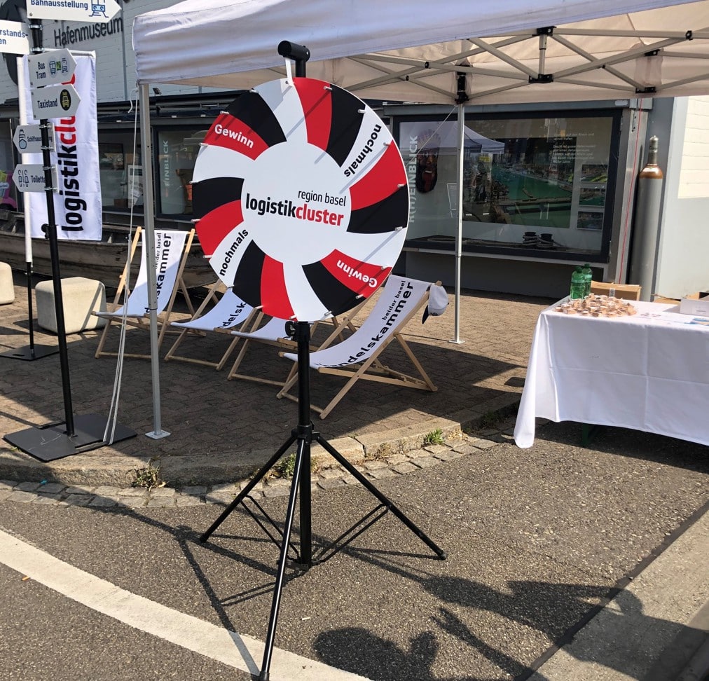 Bald startet das Hafenfest Basel 2023 in den dritten Tag und die Besucher werden wieder Schlange stehen, um am Glücksrad des Logistikclusters Region Basel zu drehen.